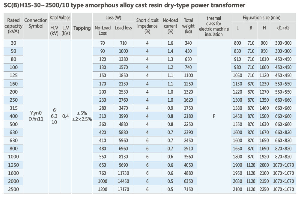 SCBH15 series amorphous alloy Dry-Type transformer has advanced performance in following points: low no-load loss, fire resistance and self-extinguishing, moisture resistance and maintenance-free. This series product can be applied in any place where the common dry-type transformer worked, such as airport, bus station, urban subway, high-rise construction and power station. And SCBH15 transformer can especially appropriate to be used in the energy-shortage and combustible, explosive places.